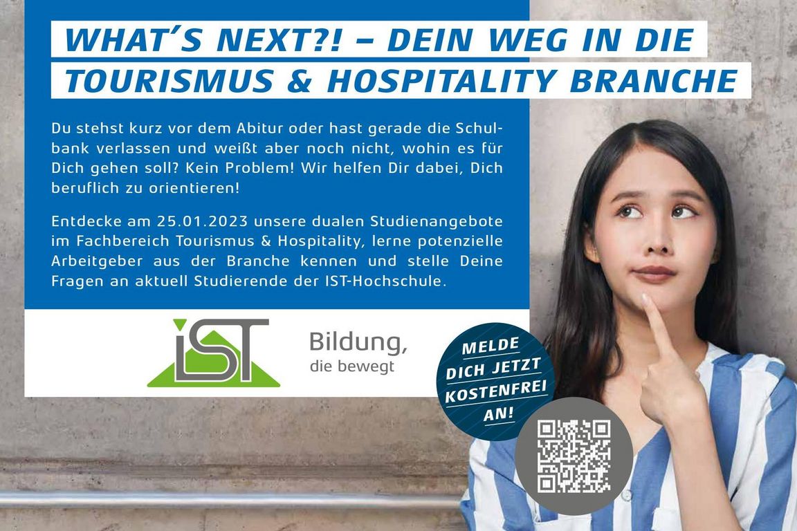 Um Abiturienten bei der Berufsorientierung zu unterstützen, findet am 25. Januar 2023 der digitale Karrieretag „What’s Next?! Dein Weg in die schönste Branche der Welt“ der IST-Hochschule für Management im Fachbereich Tourismus & Hospitality statt.