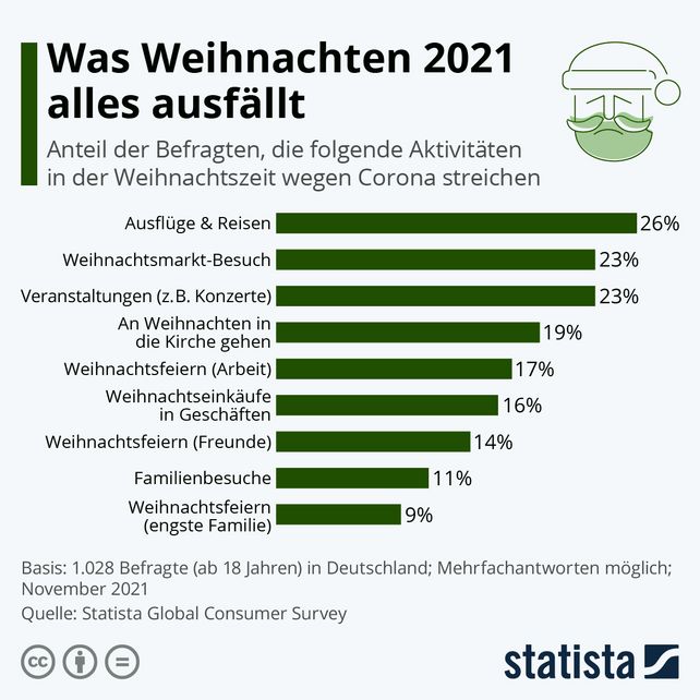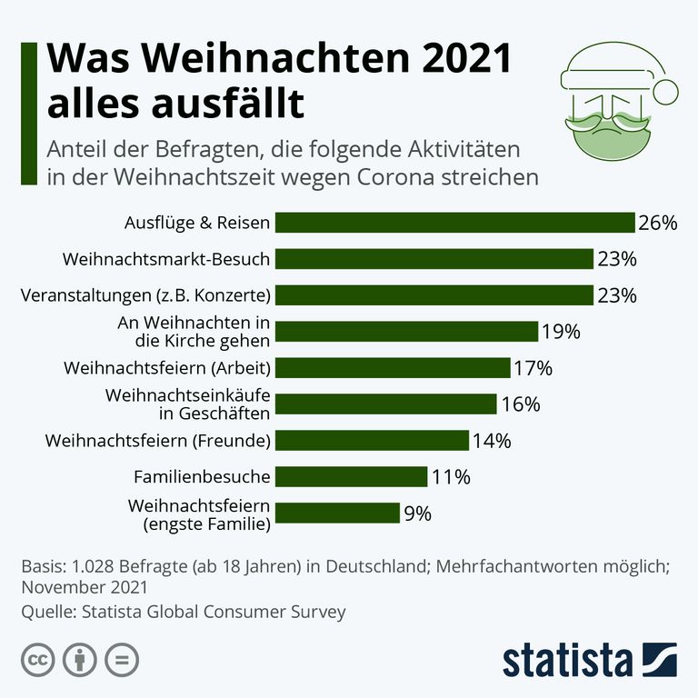 Angesicht schnell steigender Inzidenzen und sich füllender Intensivstationen fragen sich Bürger:innen, Einzelhandel und Gastronomie: Wie wird Weihnachten 2021 und wo? Schon jetzt haben viele Menschen in Deutschland Aktivitäten in der Weihnachtszeit wegen Corona gestrichen, wie das Holiday Special des Statista Global Consumer Survey zeigt. So verzichten 26 Prozent der Studienteilnehmer:innen Ende Dezember auf Ausflüge oder Reisen. Ähnlich viele verkneifen sich den Besuch eines Weihnachtsmarktes oder den Besuch von Veranstaltungen wie zum Beispiel Konzerten (jeweils 23 Prozent). Weihnachtseinkäufe in Geschäften kommen für 16 Prozent nicht in Frage. Familienbesuche im allgemeinen und Weihnachtsfeiern im engsten Familienkreis werden dagegen eher selten gestrichen.