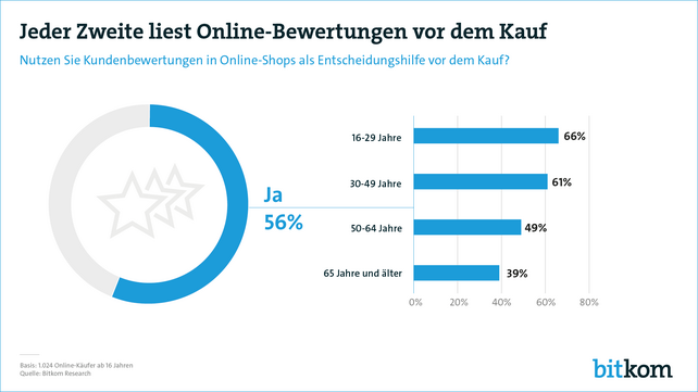 62 Prozent der Online-Shopperinnen setzen auf Bewertungen, bei den männlichen Online-Shoppern sind es 50 Prozent. Das sind die Ergebnisse einer repräsentativen Befragung im Auftrag des Digitalverbands Bitkom unter 1.024 Online-Käufern ab 16 Jahren in Deutschland. Demnach ist die Meinung anderer Käufer vor allem für die Jüngeren wichtig: 66 Prozent der 16- bis 29-Jährigen und 61 Prozent der 30- bis 49-Jährigen geben an, Online-Bewertungen vor dem Kauf zu lesen. Bei den 50- bis 64-Jährigen sind es 49 Prozent und bei den über 65-Jährigen 39 Prozent. „Unabhängige Bewertungen können eine gute Entscheidungshilfe vor einem Online-Kauf sein“, sagt Rebekka Weiß, Leiterin Vertrauen & Sicherheit beim Bitkom. „Dabei gilt bei Dienstleistungen wie bei Waren: Sicherheit und Vertrauen sind für die Kunden von Online-Shops essenziell und Bewertungen tragen maßgeblich zum Vertrauen in den Onlinehandel bei. Davon profitieren auch die Händler: Wer viele gute unabhängige Bewertungen erhält, kann damit die Qualität seiner Ware oder Dienstleistung nachweisen und macht sich so für zukünftige Kunden attraktiv.“