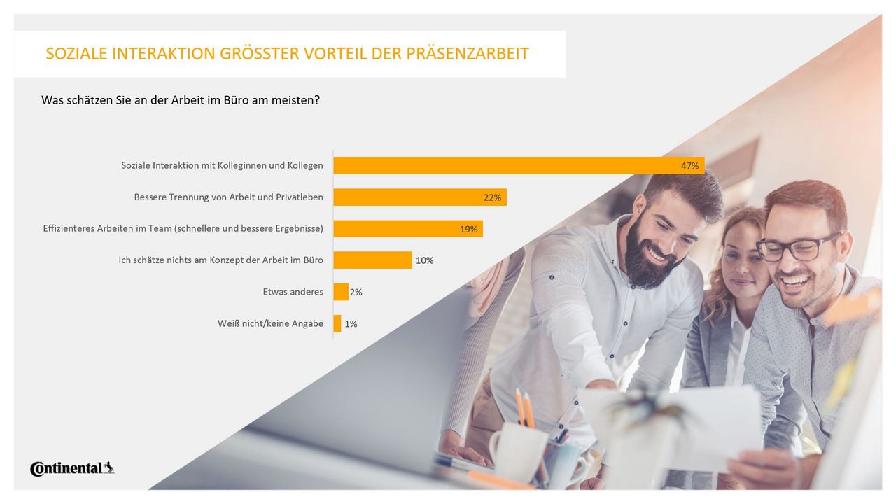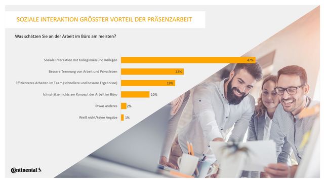 Eine knappe Mehrheit der Befragten (47 Prozent) schätzt an der Arbeit vor Ort am meisten die soziale Interaktion mit Kolleginnen und Kollegen. Rund ein Fünftel sieht in der Büroarbeit eine bessere Trennung von Arbeit und Privatleben. Knapp ein Fünftel der Befragten nennt ein effizienteres Arbeiten im Team sowie schnellere und bessere Ergebnisse als größten Vorteil der Arbeit vor Ort „Die Ergebnisse zeigen: Die Arbeitnehmerinnen und Arbeitnehmer wissen die Vorteile des Büros zu schätzen und haben ein gutes Gespür dafür, wo sie die jeweils besten Ergebnisse erzielen“, stellt Reinhart fest. „Es ist Aufgabe der Unternehmen, eine wirksame Balance zwischen der Arbeit vor Ort und mobilem Arbeiten zu schaffen und im Betrieb ein inspirierendes, kreatives Arbeitsumfeld zu bieten, das eine konstruktive Zusammenarbeit fördert.“