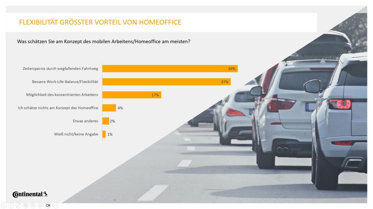 39 Prozent der Befragten schätzen am Konzept des Homeoffice beziehungsweise des mobilen Arbeitens die Zeitersparnis durch wegfallende Fahrtwege. Mehr als ein Drittel (37 Prozent) sieht dagegen eine bessere Work-Life-Balance oder die Flexibilität als größten Vorteil, während 17 Prozent die Möglichkeit des konzentrierten Arbeitens im Homeoffice am höchsten bewerten.