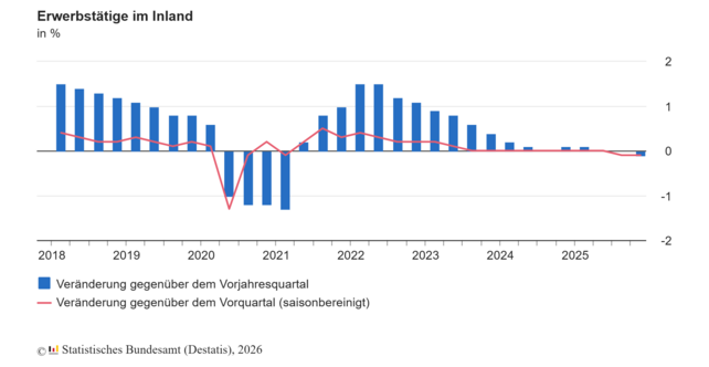Verglichen mit dem 4. Quartal 2024 sank die Zahl der Erwerbstätigen im 4. Quartal 2025 um 58.000 Personen (-0,1 Prozent). Im 3. Quartal 2025 war die Beschäftigung erstmals seit dem 1. Quartal 2021 gegenüber dem Vorjahr zurückgegangen (-16.000 Personen; 0,0 Prozent). Der Beschäftigungsanstieg im Vorjahresvergleich nach der Corona-Krise hatte seinen Höhepunkt im 2. Quartal 2022 (+679.000 Personen; +1,5 Prozent). Danach flachte der Beschäftigungszuwachs immer weiter ab. Im 1. Quartal 2025 war das Vorjahresniveau nur noch um 40.000 Personen (+0,1 Prozent) überschritten worden, im 2. Quartal 2025 lediglich um 15.000 Personen (0,0 Prozent).