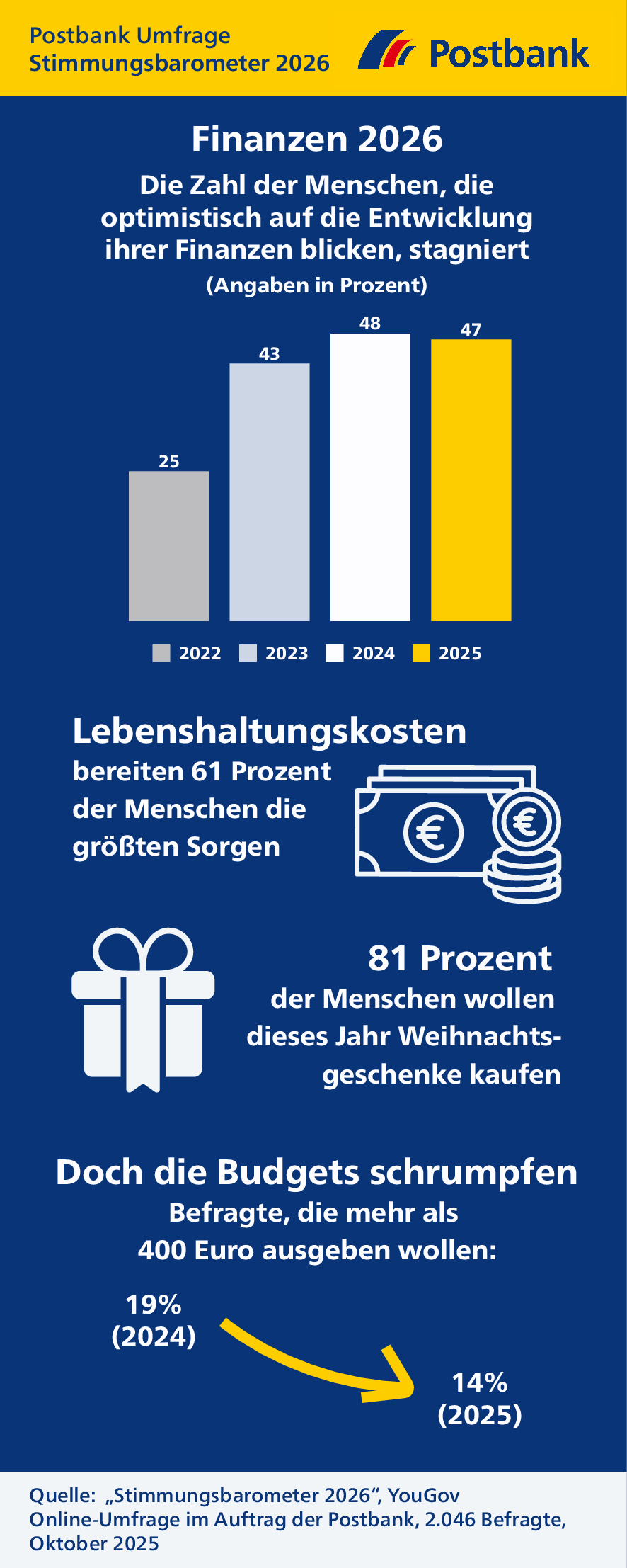 Dr. Ulrich Stephan, Chefanlagestratege für Privat- und Firmenkunden der Postbank, kommentiert die Lage: „Nach Monaten der Entspannung ziehen die Preise wieder an: Im September lag die Inflationsrate bei 2,4 Prozent, im Oktober bei 2,3 Prozent. Vor allem höhere Preise für Dienstleistungen und steigende Nettokaltmieten treiben die Teuerung. Gleichzeitig wirken die Belastungen der außergewöhnlich hohen Inflationsphase der Jahre 2022 und 2023 weiter nach. Die hohen Lebenshaltungskosten bestimmen für viele Menschen den Alltag – und sie drücken auf die Stimmung, obwohl Reallöhne und Arbeitsmarkt eigentlich positive Signale senden.“