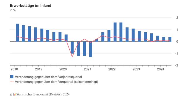 Nach Angaben des europäischen Statistikamtes Eurostat vom 14. August 2024 stieg die nach europäisch harmonisierten Methoden berechnete Erwerbstätigkeit im 2. Quartal 2024 in den 27 Staaten der Europäischen Union (EU) mit +0,7 Prozent und im Euroraum mit +0,8 Prozent gegenüber dem Vorjahresquartal durchschnittlich stärker als in Deutschland (+0,4 Prozent).