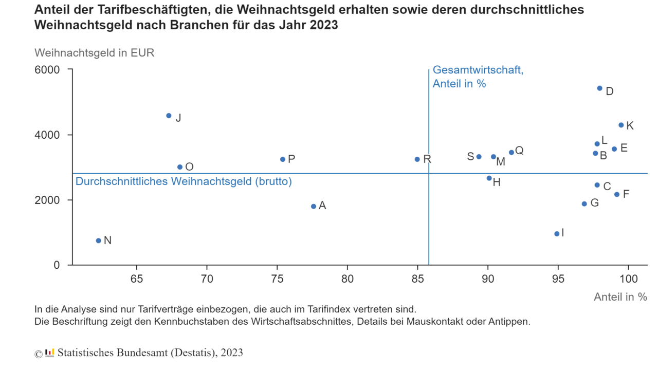 In den meisten Wirtschaftsabschnitten, zum Beispiel im Abschnitt „Finanz- und Versicherungsdienstleistungen“ und im „Baugewerbe“, erhalten mehr als 95 Prozent der Tarifbeschäftigten ein tarifliches Weihnachtsgeld. Dagegen haben in den Wirtschaftsabschnitten „Erbringung von sonstigen wirtschaftlichen Dienstleistungen“, „Information und Kommunikation“ und „Öffentliche Verwaltung, Verteidigung; Sozialversicherung“ weniger als 70 Prozent Anspruch auf ein Weihnachtsgeld.