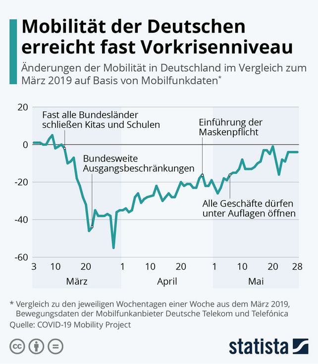 Seit Wochen schränken die Corona-Maßnahmen die Mobilität der Bürger ein. Doch wie sehr hat sich die Pandemie wirklich ausgewirkt? Diese Frage lässt sich unter anderem durch die Analyse von Bewegungsdaten von Mobilfunkanbietern klären. Statista hat dazu auf Basis von Daten des COVID-19 Mobility Project des Robert Koch Instituts (RKI) und der Berliner Humboldt Universität eine entsprechende Grafik erstellt.