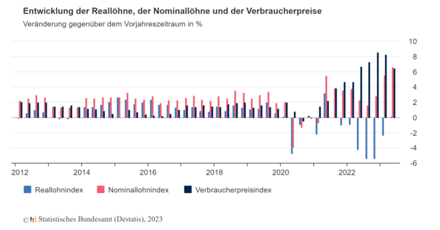 Die starke Steigerung der Nominallöhne und die im Vergleich etwas gedämpfte Inflationsentwicklung führten im 2. Quartal 2023 zu diesem leichten Reallohnwachstum. Dazu haben auch die Auszahlungen der Inflationsausgleichsprämie beigetragen. Diese kann bis zu 3.000 Euro betragen (steuer- und abgabefrei) und ist eine freiwillige Leistung der Arbeitgeber. Auch die Erhöhung des Mindestlohns auf 12 Euro pro Stunde im Oktober 2022 hatte einen positiven Effekt auf das gesamtwirtschaftliche Lohnwachstum im 2. Quartal 2023.