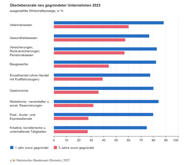 Besonders niedrig war die Überlebensrate auch bei Post-, Kurier- und Expressdiensten mit 27,9 Prozent sowie bei Reisebüros und -veranstaltern mit 31,9 Prozent. Dagegen überstanden im Veterinärwesen drei von fünf neu gegründeten Unternehmen (60,2 Prozent) die ersten fünf Jahre. Vergleichsweise hoch war die Überlebensrate auch im Gesundheitswesen (57,4 Prozent) sowie bei Versicherungen, Rückversicherungen und Pensionskassen (56,8 Prozent).