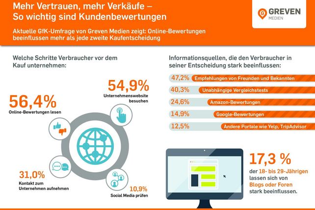 Eine aktuelle repräsentative GfK-Umfrage im Auftrag von Greven Medien zeigt: Der deutsche Konsument trifft seine Entscheidung für den Kauf einer Ware oder die Beauftragung eines Dienstleisters durchdacht. Mehr als die Hälfte sucht im Vorfeld nach Bewertungen im Internet (56,4 %) oder besucht die unternehmenseigene Website (54,9 %).