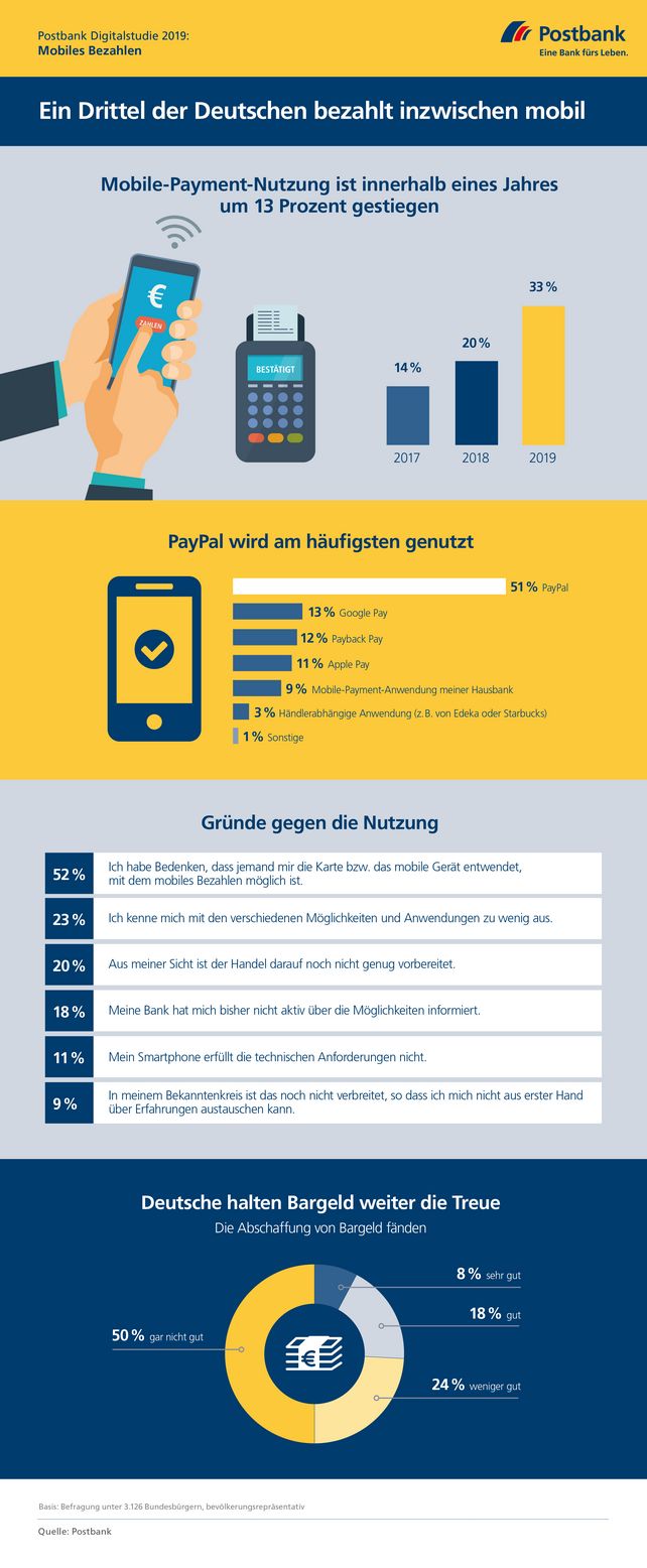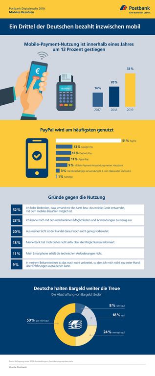 Mobile Payment setzt sich immer stärker durch. Die Zahl der Nutzer in Deutschland ist im Vergleich zum Vorjahr kräftig gestiegen. 33 Prozent zahlen mittlerweile kontaktlos per Bank- oder Kreditkarte sowie mittels Smartphone oder -watch. Im vergangenen Jahr war es erst jeder Fünfte. Der Anteil derjenigen, die mobile Bezahlsysteme ablehnen, ist von 61 Prozent im vergangenen Jahr auf 47 Prozent geschrumpft. Dies sind unter anderem Ergebnisse der repräsentativen Postbank-Studie "Die digitalen Deutschen 2019", für die 3.126 Bundesbürger befragt wurden.