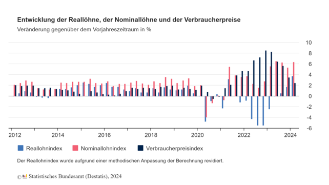 Die Nominallöhne in Deutschland waren im 1. Quartal 2024 um 6,4 Prozent höher als im Vorjahresquartal. Das war der zweithöchste Nominallohnanstieg gegenüber einem Vorjahresquartal seit Beginn der Zeitreihe im Jahr 2008. Die Verbraucherpreise erhöhten sich im selben Zeitraum um 2,5 Prozent.