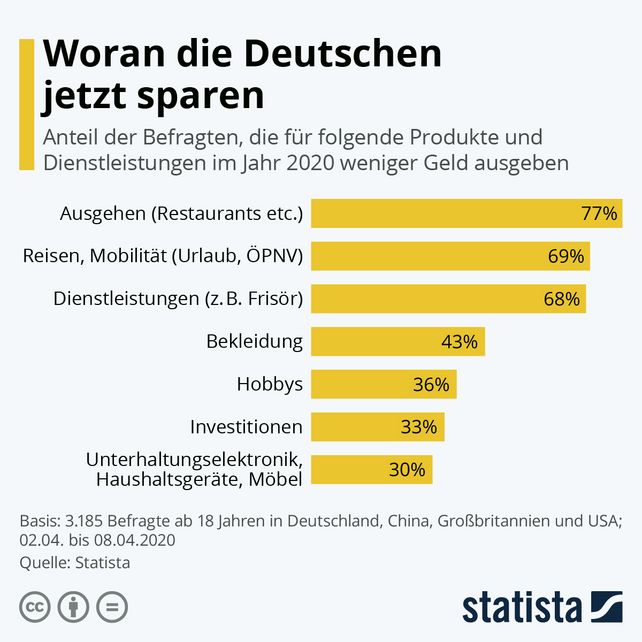 Die Corona-Krise beeinflusst stark das Konsumverhalten der Deutschen. Laut einer Statista-Umfrage verzichten die Bundesbürger derzeit vor allem aufs Ausgehen, zum Beispiel ins Restaurant. Doch auch beim Buchen von Reisen und Dienstleistungen wie dem Friseurbesuch wird kräftig reduziert. Dies ist keine große Überraschung, da der internationale Flugverkehr praktisch zum Erliegen gekommen ist und Hotels und Restaurants geschlossen sind.