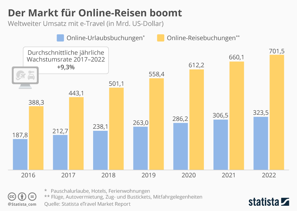 Laut Statista eTravel Market Report steigt der weltweite Umsatz mit Online-Reisebuchungen in den nächsten Jahren kontinuierlich an. Die Analysten rechnen mit einem jährlichen Zuwachs von 9,3 Prozent.