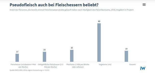 Vier Fünftel von denen, die Ersatzprodukte für Steak, Wurst & Co. bereits probiert haben, können sich vorstellen, sie erneut zu kaufen. Sogar unter denen, die mindestens vier Mal pro Woche Fleisch essen, können sich zwei Drittel vorstellen, erneut Ersatzprodukte zu kaufen. Die Autoren der Studie erklären die Offenheit damit, dass übermäßiger Fleischkonsum in der öffentlichen Debatte mittlerweile häufig in der Kritik steht. Laut Landwirtschaftsministerium bezeichnen sich allerdings nur rund sechs Prozent der Deutschen als Vegetarier.