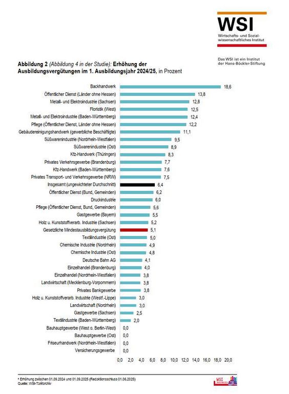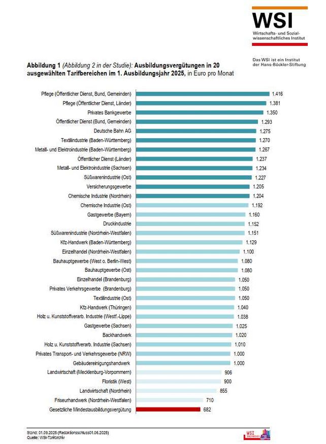 Besonders problematisch ist die Lage laut WSI dort, wo keine Tarifbindung besteht. Hier liegt die Ausbildungsvergütung oft nur bei der gesetzlichen Untergrenze. Der Deutsche Gewerkschaftsbund fordert deshalb eine Anhebung der Mindestausbildungsvergütung auf mindestens 834 Euro pro Monat – das wären 80 Prozent des tariflichen Durchschnitts.