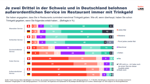 Bei einer Sache sind sich Schweizer und Deutsche einig: Schlechter Service wird nicht mit Trinkgeld belohnt: 62 Prozent der Schweizer geben bei miserablem Service im Restaurant nie ein Trinkgeld. In Deutschland sagen dies 50 Prozent. In beiden Ländern sagen hingegen jeweils 67 Prozent, außerordentlichen Service jedes Mal mit Trinkgeld zu belohnen.