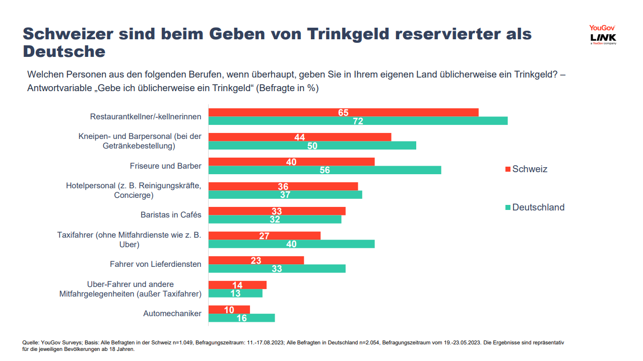 Doch nicht nur in der Restaurant-Gastronomie geben Deutsche etwas häufiger als Schweizer üblicherweise ein Trinkgeld: Kneipen- und Barpersonal geben 44 Prozent der Schweizer Trinkgeld, in Deutschland tut dies eigenen Angaben zufolge die Hälfte der Bevölkerung (50 Prozent). Friseuren und Barbern geben 40 Prozent der Schweizer üblicherweise Trinkgeld (vs. 56 Prozent in Deutschland). Aber auch bei Taxifahrern ist die Differenz sehr deutlich: In der Schweiz gibt rund jeder Vierte (27 Prozent) einem Taxifahrer (ausgenommen Mitfahrdienste, wie z.B. Uber) Trinkgeld, in Deutschland sind es zwei von fünf (40 Prozent).
