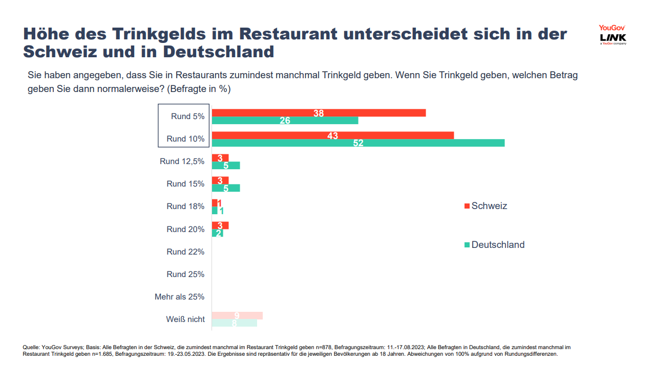 Unter jenen Schweizern, die manchmal oder üblicherweise im Restaurant ein Trinkgeld geben, sagen 38 Prozent, einen Betrag von rund 5 Prozent des Rechnungsbetrages zu geben. Deutsche geben im Vergleich seltener rund 5 Prozent (26 Prozent).