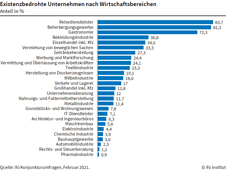 Die stärksten Existenzängste verspürt die Reisebranche mit 83,7 Prozent der Firmen, Hotels mit 82,3 Prozent sowie Restaurants und Gaststätten mit 72,3 Prozent. Es folgen die Vermietung von beweglichen Sachen mit 33,3 Prozent, die Getränkeherstellung mit 27,3 Prozent sowie Werbung und Marktforschung mit 24,4 Prozent.