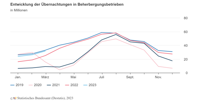Die Zahl der Übernachtungen von Gästen aus dem Inland stieg im März 2023 gegenüber dem Vorjahresmonat um 22,4 Prozent auf 26,7 Millionen. Das waren fast so viele Übernachtungen wie im März 2019 (-1,1 Prozent).