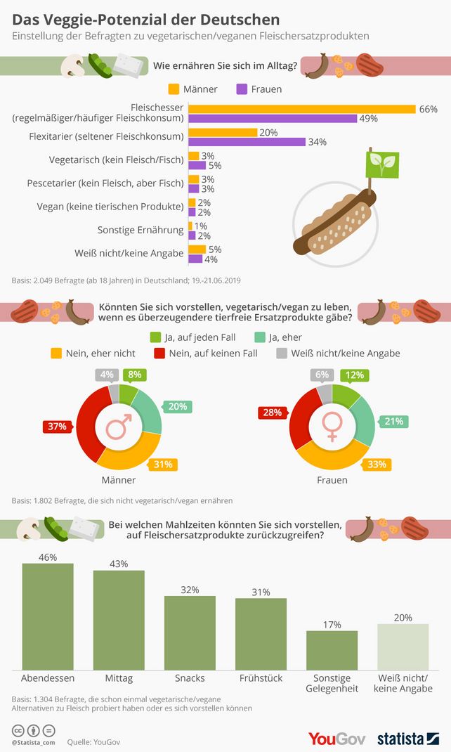 In einer gemeinsamen Umfrage des Datenportals Statista und dem Meinungsforschungsinstitut YouGov gibt jede dritte Fleischesserin (33 Prozent) und 28 Prozent der Fleischesser an, sich vorstellen zu können, mit einer guten Alternative auf Fleisch zu verzichten. Das Abendessen ist dabei die Mahlzeit, bei der die Produkte am besten zum Einsatz kommen können, gefolgt vom Mittag.