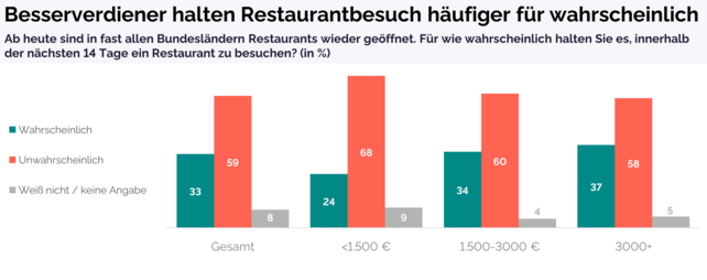Essengehen ist häufig auch abhängig vom Geldbeutel. Jene Befragte, deren Nettoeinkommen pro Haushalt 3.000 Euro übersteigt, geben häufiger an, innerhalb der ersten 14 Tagen nach Wiedereröffnung ein Restaurant besuchen zu wollen (37 vs. 24 Prozent der Einkommensschwächeren mit weniger als 1.5000 Euro Nettoeinkommen pro Haushalt). Und eine deutliche Mehrheit der Einkommensschwächeren (68 Prozent) sagt häufiger, keinen Restaurantbesuch in dieser Zeit einzuplanen (vs. 58 Prozent derjenigen mit mindestens 3.000 Euro Nettoeinkommen).