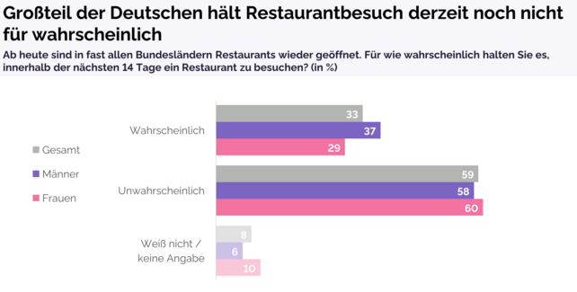 Ein Drittel der Deutschen (33 Prozent) hält es für wahrscheinlich, innerhalb der ersten 14 Tage nach den Wiedereröffnungen der Lokale ein solches zu besuchen. Dies sagen Männer häufiger als Frauen (37 vs. 29 Prozent der Frauen). Die Mehrheit (59 Prozent) der Deutschen hält einen Restaurantbesuch in dieser Zeit nicht für wahrscheinlich. Dies sind Ergebnisse einer aktuellen YouGov-Umfrage.