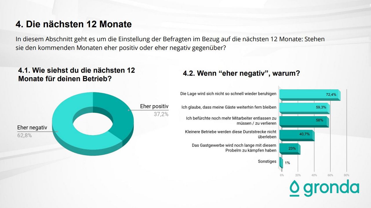 Auch den kommenden 12 Monaten stehen über 60 Prozent der Befragten eher skeptisch gegenüber. Sie glauben nicht, dass sich die Situation so schnell wieder beruhigt und befürchten, dass Gäste weiterhin fern bleiben.