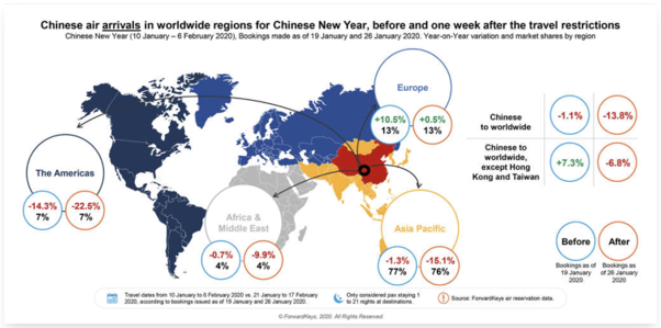 Da die weltweite Verbreitung des Virus einige Länder zur Sperrung zwingt und Fluggesellschaften sowohl Inlands- als auch Auslandsflüge aus bestimmten Regionen stornieren, sind sowohl Leisure- als auch Businessreisesegmente stark betroffen. Die Auswirkungen sind weitaus schwerwiegender, da China 2019 der weltweit größte Markt für Outbound-Tourismus war. 159 Millionen Outbound-Reisende machten 12,2% aller Outbound-Reisen aus und gaben 275 Mrd. USD aus.
