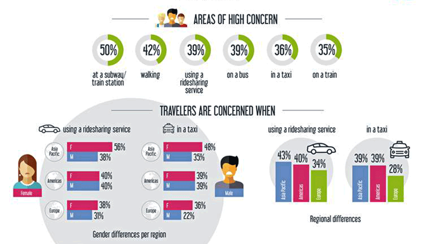Da Fahrgemeinschaftsdienste wie Uber häufiger werden und mancherorts die traditionellen Taxis verdrängen, machen einige Reisende mittlerweile wenig Unterschied zwischen den Angeboten. In Taxis fühlen sich die Geschäftsreisenden laut CWT aber immer noch etwas sicherer. Am stärksten betroffen sind Reisende aus dem asiatisch-pazifischen Raum: 43 Prozent von ihnen werden in Mitfahrgelegenheiten nervös. In Amerika sind es 40 Prozent, in Europa 34 Prozent.