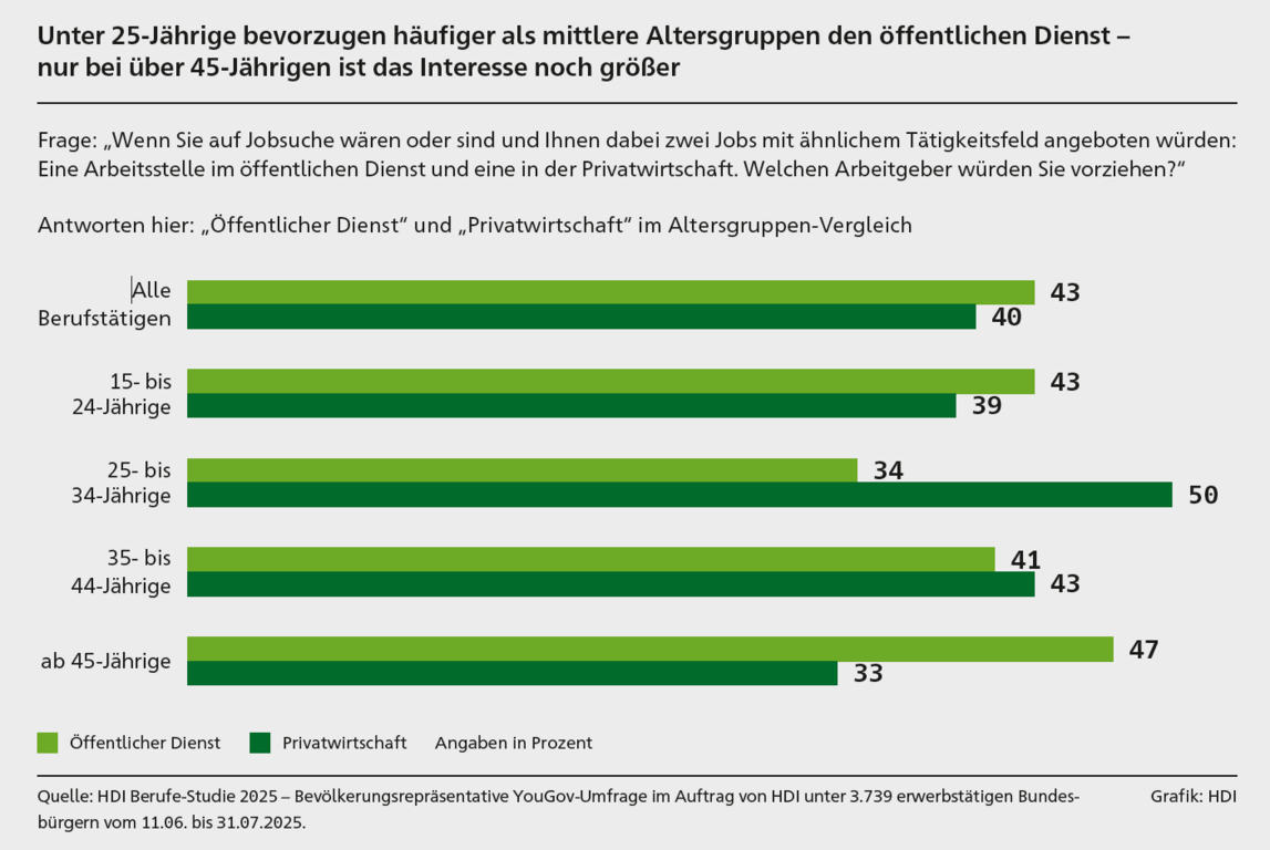 Der öffentliche Sektor wird für viele Arbeitnehmer zunehmend attraktiver. Insgesamt würden sich 43 Prozent der Befragten bei gleicher Tätigkeit für eine Stelle im öffentlichen Dienst entscheiden, verglichen mit 40 Prozent, die die Privatwirtschaft bevorzugen. Dieser Trend ist besonders bei den unter 25-Jährigen und über 45-Jährigen stark.