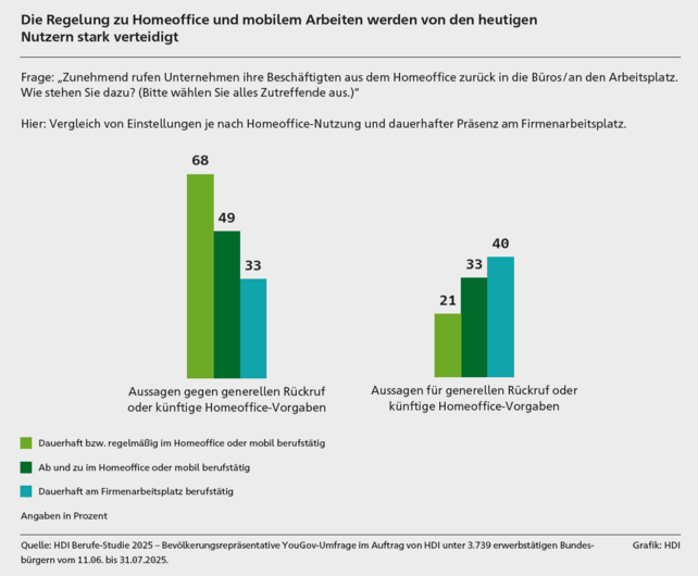 Die Flexibilität durch das Homeoffice ist für viele nicht mehr wegzudenken. Mehr als zwei Drittel (68 Prozent) derjenigen, die bereits regelmäßig oder dauerhaft mobil arbeiten, lehnen restriktivere Regelungen oder eine Rückkehr ins Büro ab. Bei jenen, die dauerhaft im Büro arbeiten, teilt nur ein Drittel diese Ansicht.