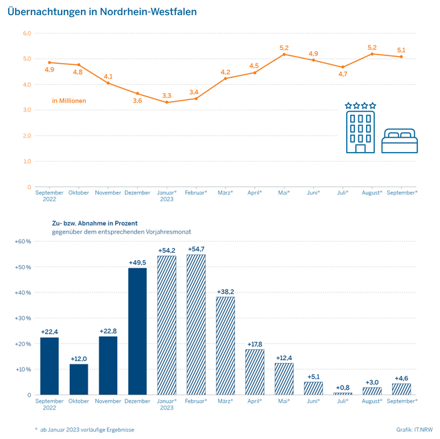 Die Zahl der Übernachtungen ist mit rund 5,1 Millionen um 4,6 Prozent höher gewesen als im September 2022 (damals: 4,9 Millionen). Gegenüber September 2019 (damals 4,9 Millionen) nahm sie um 4,5 Prozent zu.