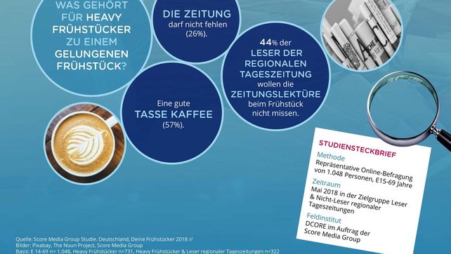 Dies ist ein Ergebnis der repräsentativen Studie „Deutschland, deine Frühstücker“, die das Marktforschungsinstitut DCORE im Auftrag des Crossmedia-Vermarkters Score Media Group durchgeführt hat. Neben einer guten Tasse Kaffee (57 Prozent) gehört demnach für rund jeden vierten deutschen „Heavy Frühstücker“ unbedingt eine Zeitung zu einem gelungenen Frühstück (26 Prozent). Unter den Lesern der Regionalzeitung sind es sogar 44 Prozent, die die morgendliche Zeitungslektüre nicht missen wollen. Jeder vierte Leser der regionalen Tageszeitung lässt sich besonders gerne von Angeboten für Frühstücksprodukte in der Tageszeitung inspirieren.