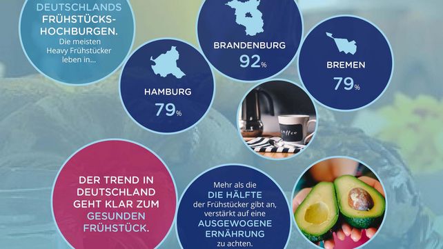 Wesentlich größere Unterschiede im Frühstücksverhalten als zwischen den Geschlechtern offenbaren sich beim Blick auf die Bundesländer – hier gibt es ein deutliches Nord-Süd-Gefälle. Mit 92 Prozent „Heavy Frühstücker“ ist Brandenburg die Frühstücksbastion der Nation. Auch in Hamburg und Bremen (beide 79 Prozent) steht die erste Mahlzeit am Tag hoch im Kurs, wogegen die Bayern (61 Prozent) und Rheinland-Pfälzer (66 Prozent) eher als Frühstücksmuffel bezeichnet werden können.