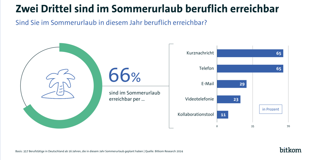 Meisten sind es ein Anruf oder eine Kurznachricht, die den Urlaub unterbrechen: Jeweils rund zwei Drittel (65 Prozent) der Berufstätigen sind telefonisch beziehungsweise per Kurznachrichten wie SMS oder WhatsApp erreichbar. 29 Prozent lesen oder beantworten dienstliche Mails. Knapp ein Viertel (23 Prozent) ist per Videocall etwa über Facetime oder Zoom erreichbar, 11 Prozent über Kollaborationstools wie Microsoft Teams oder Slack.